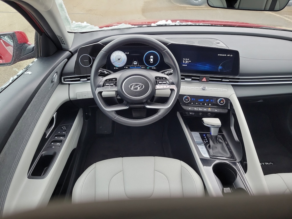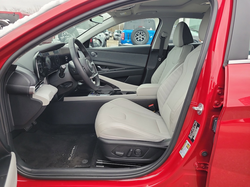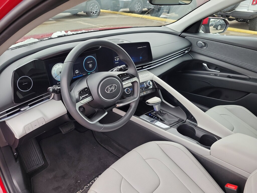 CARFAX One-Owner. Clean CARFAX. Scarlet Red Pearl 2023 Hyundai Elantra Limited FWD CVT I4 Elantra Limited, 4D Sedan, I4, CVT, FWD, Scarlet Red Pearl, Gray Leather, 8 Speakers, Air Conditioning, Alloy wheels, AM/FM radio: SiriusXM, Automatic temperature control, Brake assist, Electronic Stability Control, Exterior Parking Camera Rear, Front Bucket Seats, Front Center Armrest, Front dual zone A/C, Heated Front Seats, Heated front seats, Leather-Trimmed Seats, Navigation System, Option Group 01, Power driver seat, Power moonroof, Radio: AM/FM/HD/SiriusXM Display Audio, Rear window defroster, Remote keyless entry, Speed-sensing steering, Steering wheel mounted audio controls, Traction control.